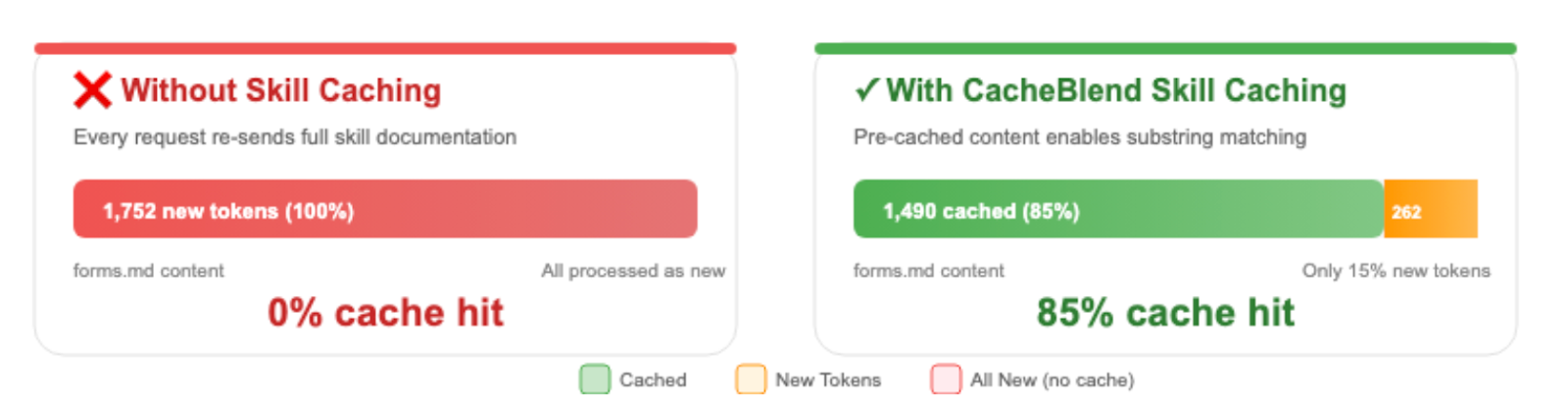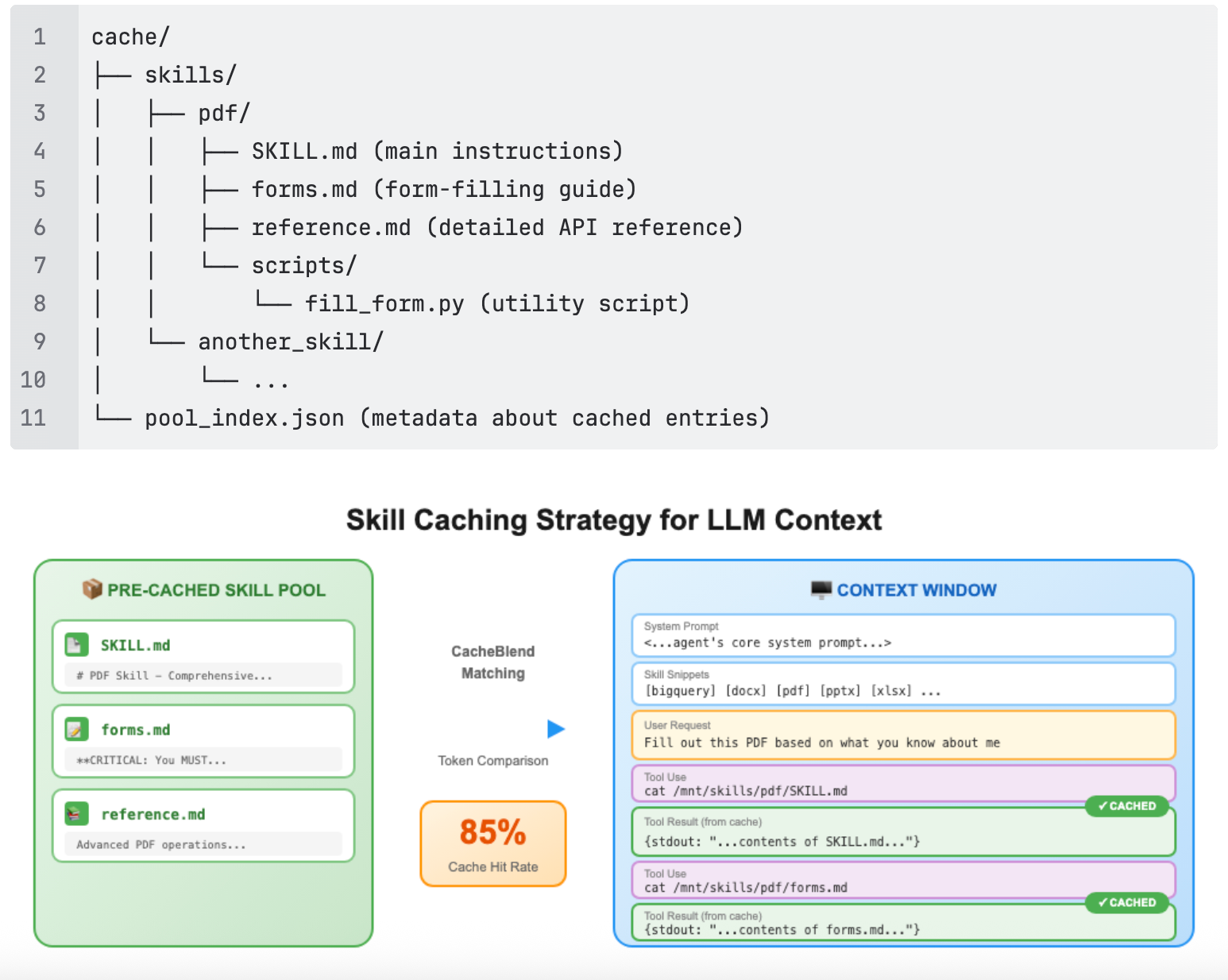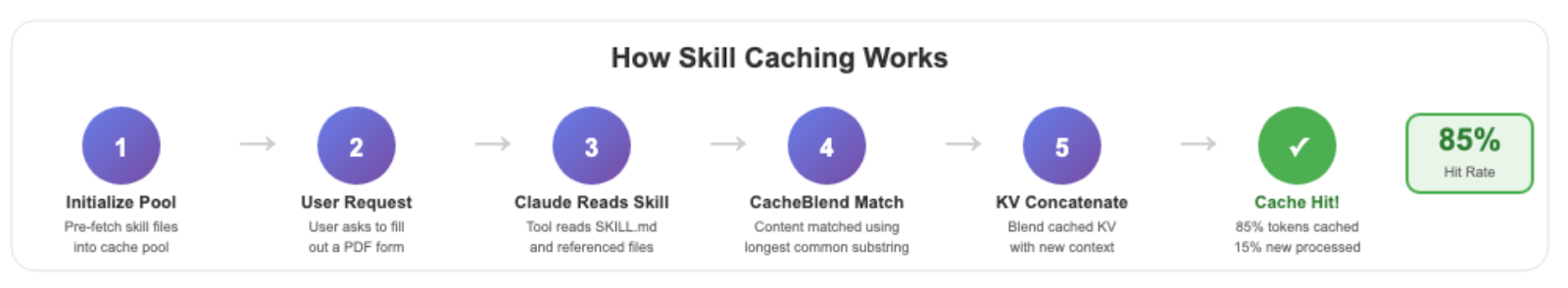 For Agent Skills, traditional prompt caching gives you very small (close to 0%) cache hit rate. We have been working on a non-prefix caching technique, called CacheBlend, with which we achieve 63.6-85.0% cache hit rates on skill-related content, potentially making any agent cheaper to run and delivering answers faster.
