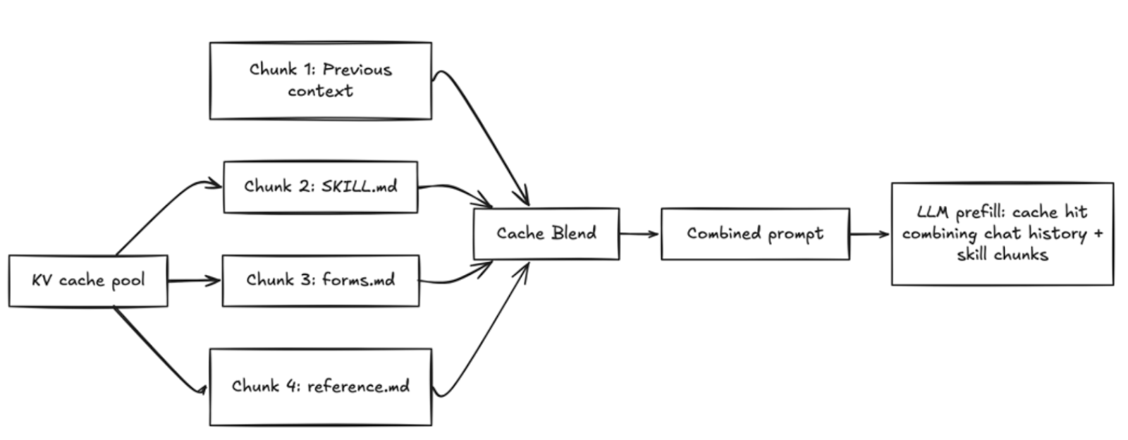Traditional prefix caching requires skill content to appear at the exact same position in every prompt. However, with CacheBlend, we can concatenate pre-cached skill KV states with the existing context at any position.